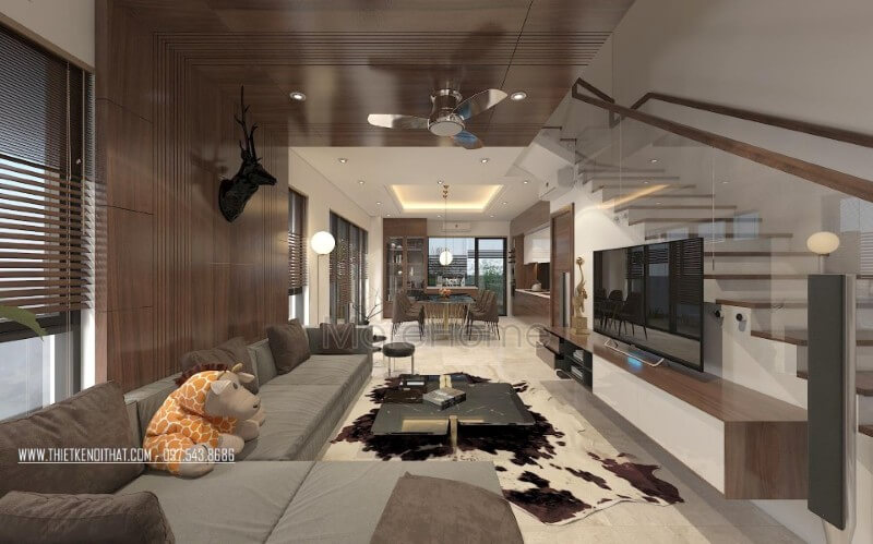 Thiết kế nội thất phòng khách biệt thự gỗ công nghiệp với gam màu ấm áp mang lại sự sang trọng và dễ chịu cho gia chủ
