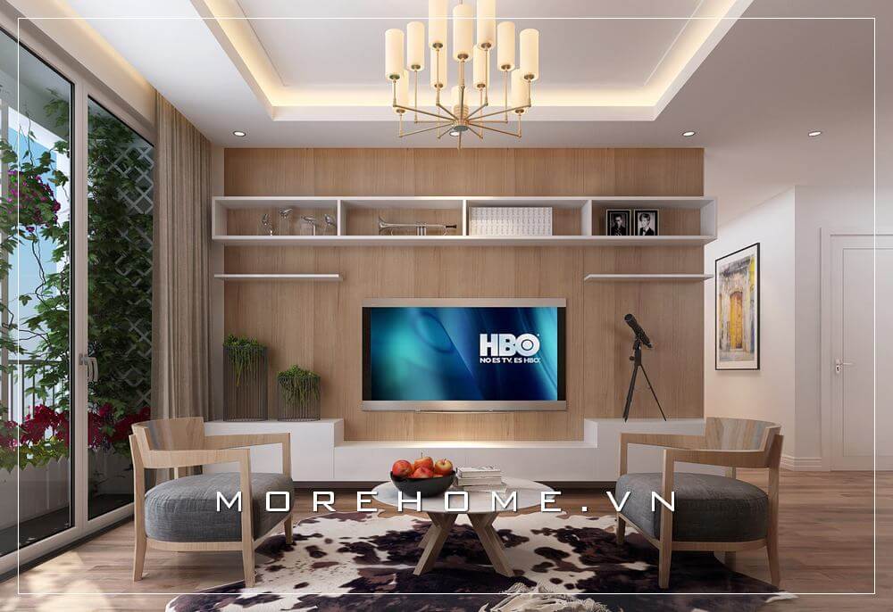 Thiết kế nội thất phòng khách chung cư hiện đại độc đáo với gỗ ốp tường trang trí