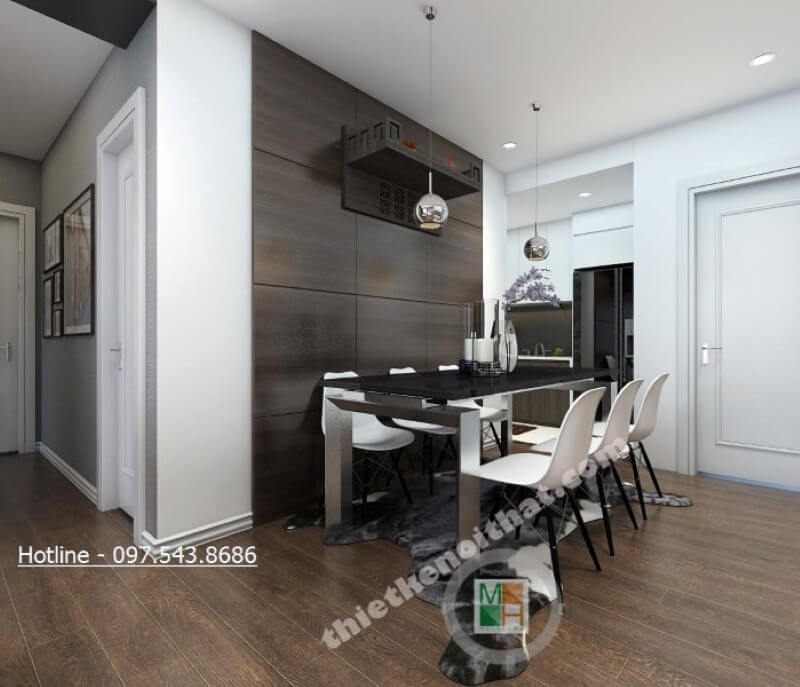 Mẫu bàn ăn khá đơn giản với thiết kế không cầu kỳ họa tiết, tone màu nâu đậm kết hợp gỗ tự nhiên giúp không gian trở nên mở, tạo sự đồng nhất cho không gian nhà chung cư