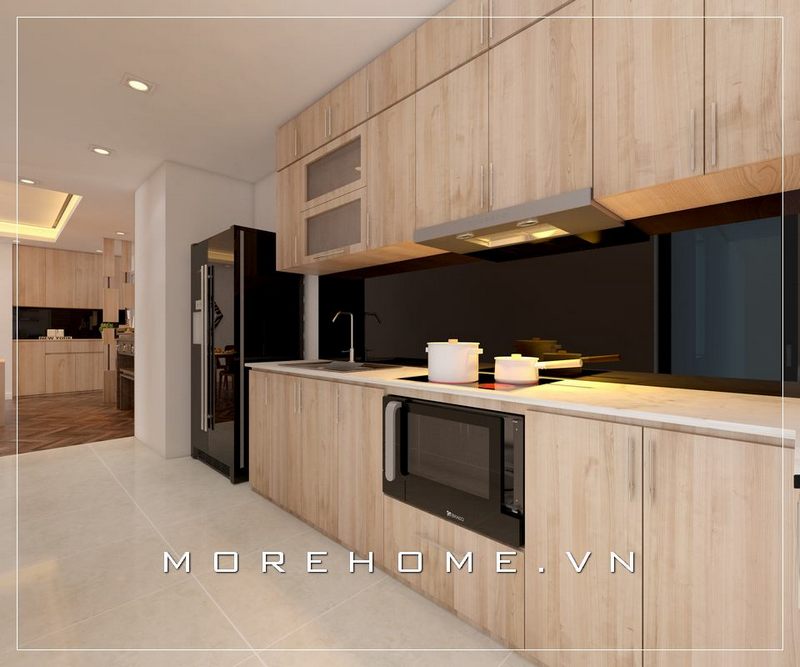 Thiết kế nội thất phòng bếp đẹp với nội thất bếp tone màu sáng tạo nên không gian thoáng đãng và rộng rãi hơn.