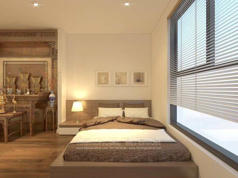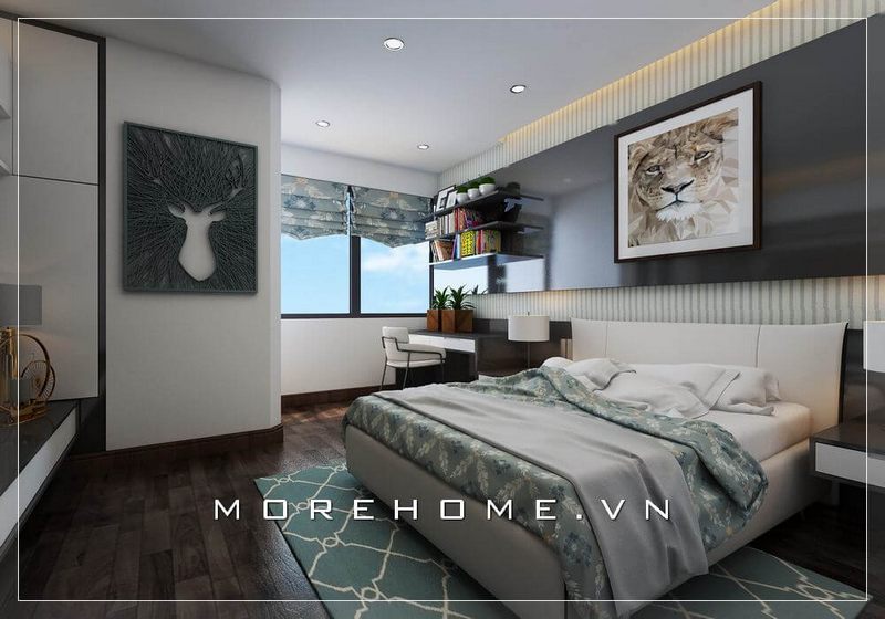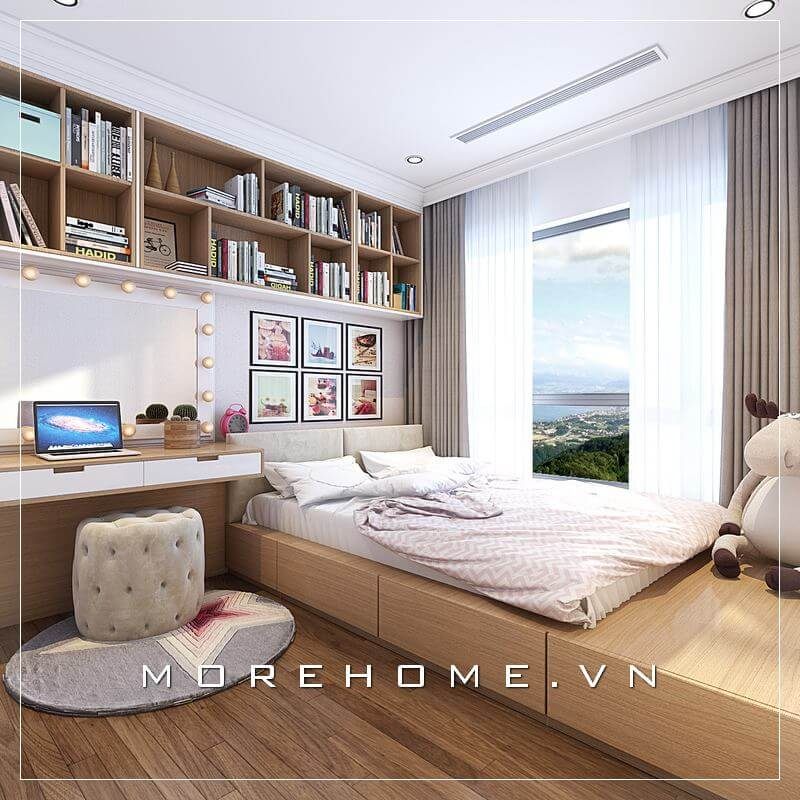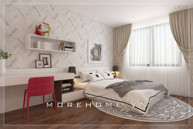 Bố trí nội thất phòng ngủ chung cư khoa học và hợp lý, chiếc giường ngủ hiện đại, đơn giản với chất liệu gỗ công nghiệp tạo nên cho không gian phòng ngủ thêm thoáng rộng hơn