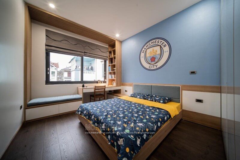 Mẫu nội thất phòng ngủ bé trai này được thi công hoàn thiện chất lượng cao với giường ngủ gỗ công nghiệp hiện đại đầu giường bọc đệm, bàn học liền giá sách...tại biệt thự 4 tầng ở Nghệ An