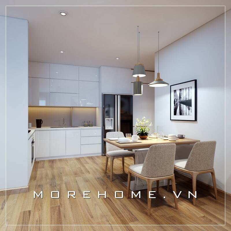 Mẫu tủ bếp gỗ công nghiệp màu trắng, cùng thiết bị phòng bếp hiện đại tạo nên không gian nấu nướng tiện nghi cho người nội trợ