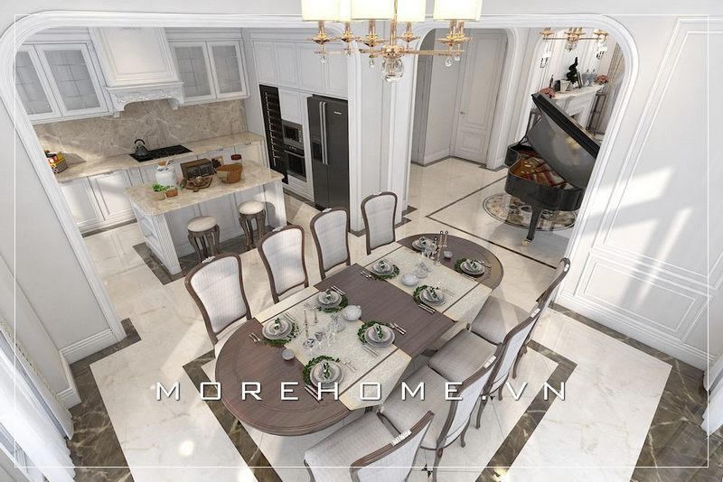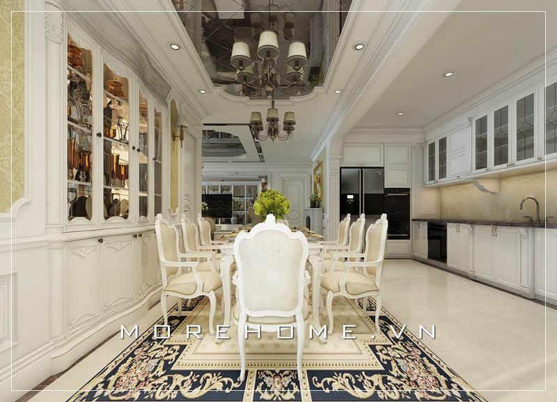Mẫu tủ bếp gỗ sơn trắng, thiết kế tân cổ điển cho phòng bếp biệt thự