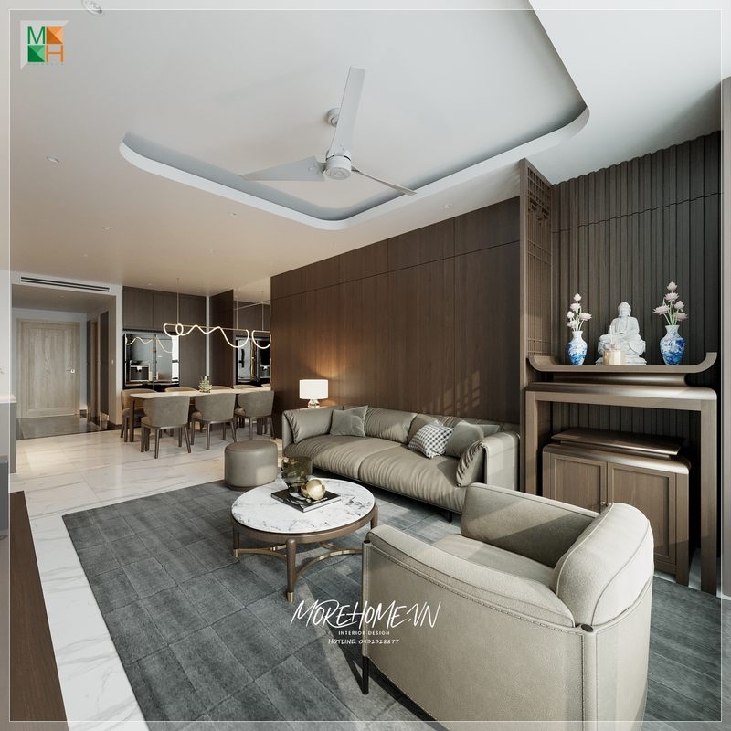 Thiết kế nội thất phòng khách liền bếp cho chung cư với điểm nhấn là bộ sofa tân cổ điển cho không gian thêm phần ấn tượng