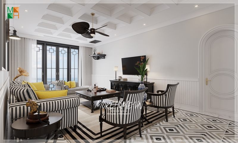 Mẫu thiết kế phòng khách với nội thất gỗ tự nhiên bọc nỉ sọc ltông đen - trắng ấn tượng cho phòng khách chung cư, nhà phố, biệt thự phong cách Indochine