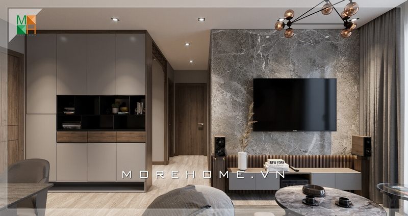 Căn hộ chung cư với lựa chọn thông minh theo phong cách hiện đại sử dụng gỗ óc chó kết hợp đá ốp tường mới lạ gây thu hút đầy ấn tượng.