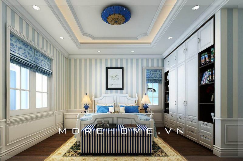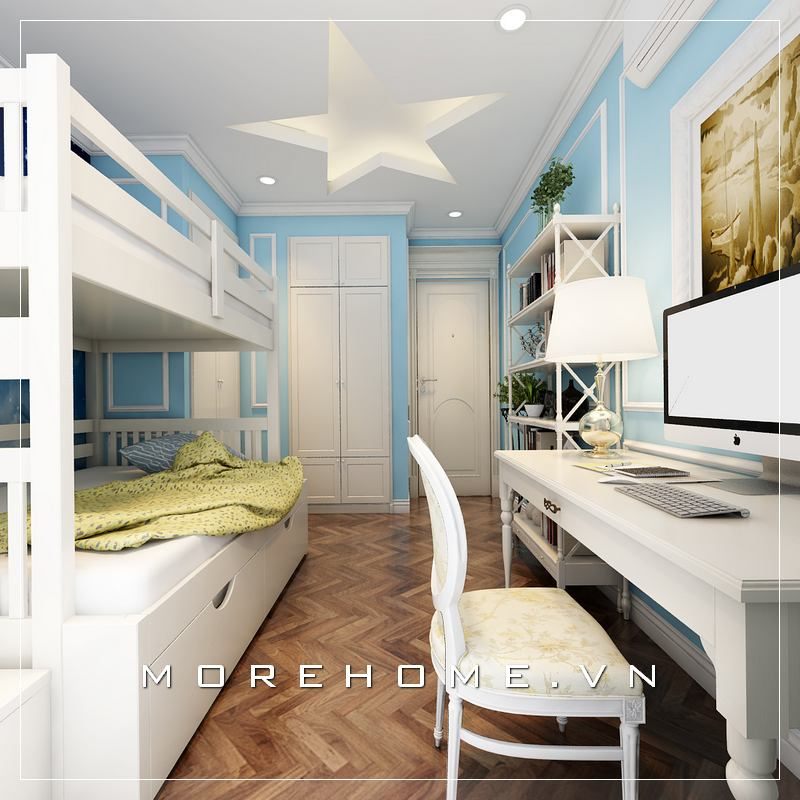 Thiết kế phòng ngủ của con trai thường chú trọng màu xanh cùng họa tiết bắt mắt thường sẽ làm không gian trở nên bị tối vì vậy việc đan xen với tone màu trắng sẽ làm hài hòa thêm vẻ đẹp cho căn phòng. Bạn có thể kết hợp từ tủ quần áo, cửa thông phòng, bàn ghế, kệ trang trí màu trắng.