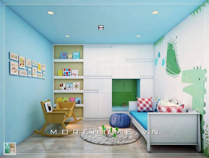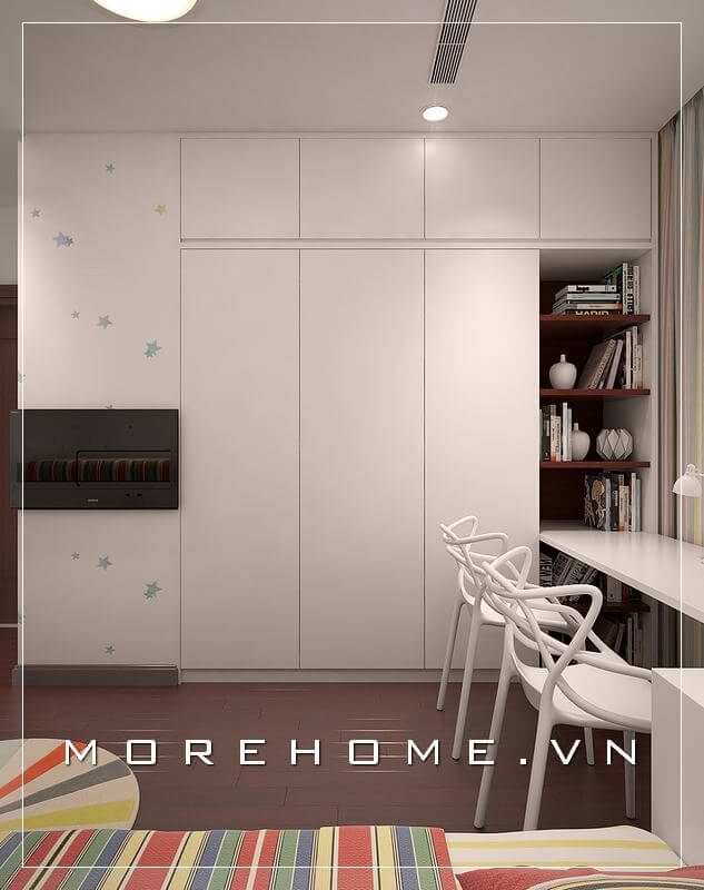 Tủ quần áo trẻ em hiện đại được thiết kế âm tường kịch trần, mang lại cho không gian nghỉ ngơi của con thêm rộng và thoáng hơn