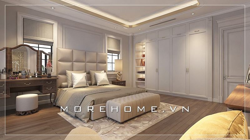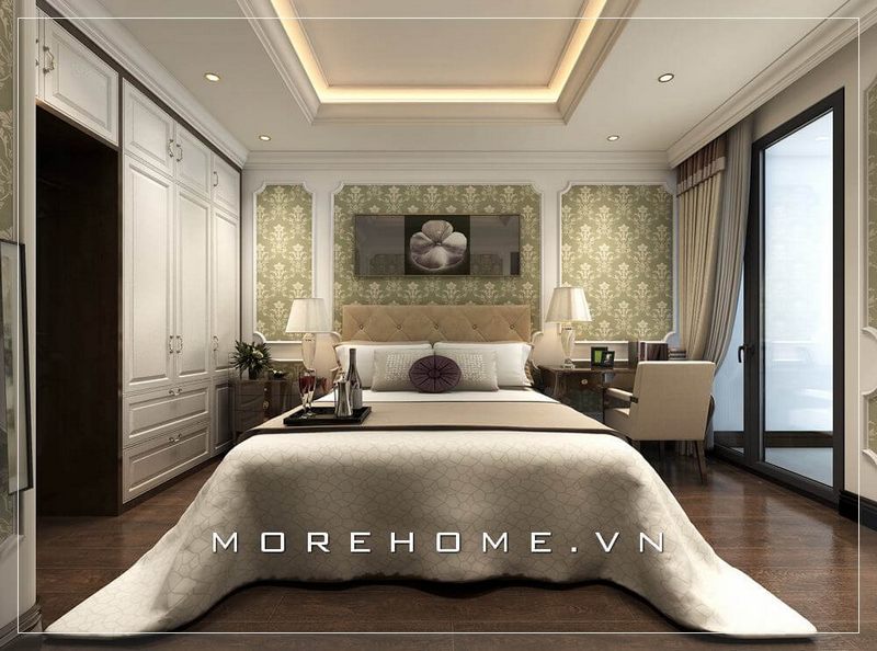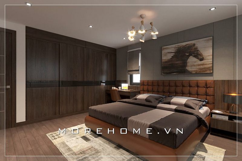 Mẫu thiết kế nội thất phòng ngủ CT4 Mỹ Đình hiện đại tiên nghi với hệ tủ quấn âm tường, giường ngủ gỗ cao cấp