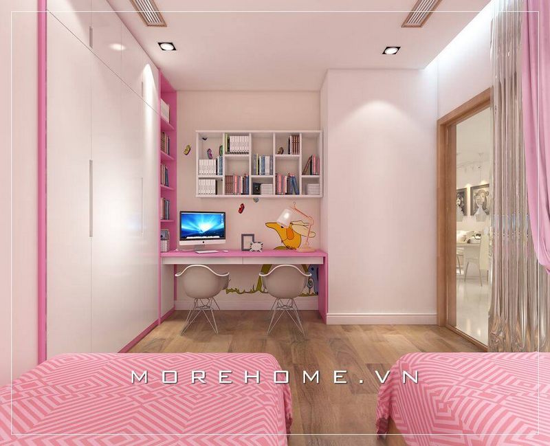 Hệ thống tủ gỗ Acrylic đẹp thiết kế âm tường, tạo khu vực lưu trữ đồ lớn, phù hợp diện tích phòng ngủ và tiện nghi hơn cho phòng của bé gái