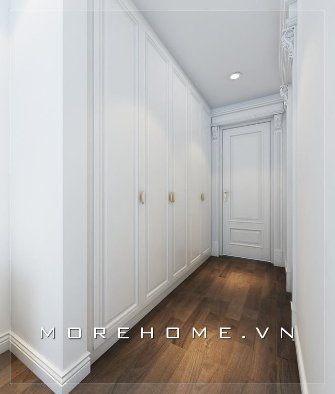 Mẫu thiết kế tủ quần áo màu trắng tân cổ điển rất tinh tế. Lối thiết kế kịch trần âm tường phù hợp cho không gian nội thất căn hộ chung cư, nhà phố, biệt thự,...