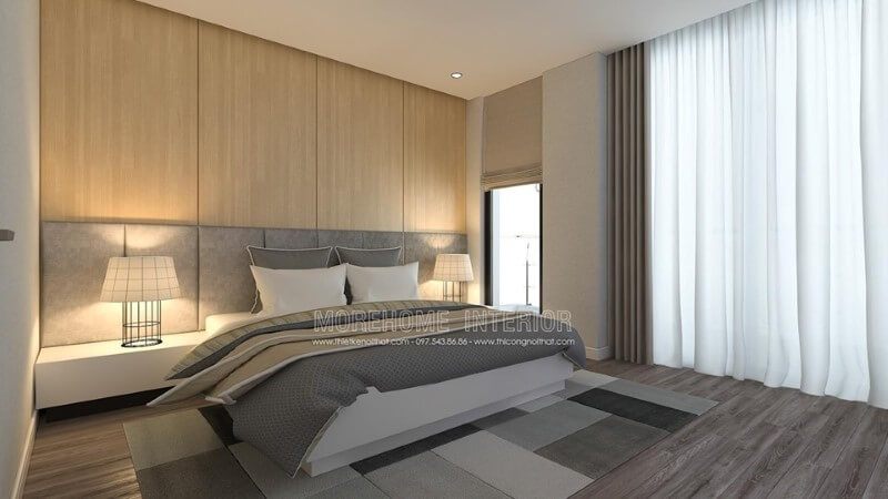 Giường ngủ thiết kế hiện đại, đơn giản, phần tab đầu giường liền mạch là nơi để được nhiều đồ dùng cá nhân của gia chủ hơn: đèn bàn, kính, sách báo...