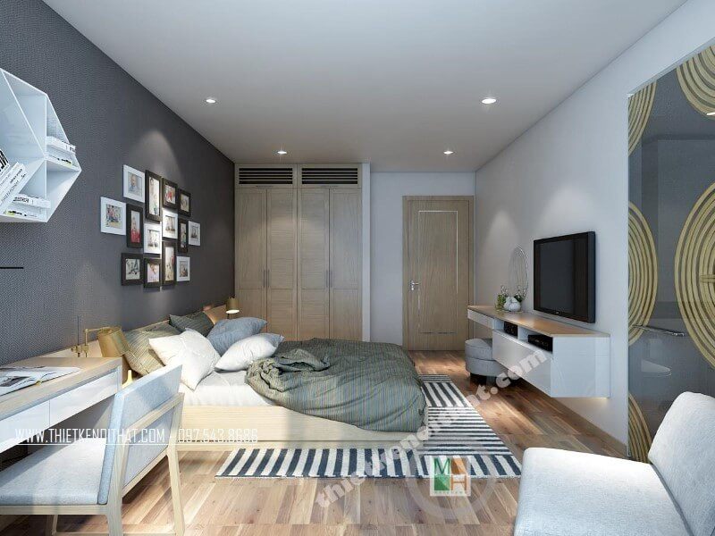 Mẫu thiết kế nội thất phòng ngủ chung cư hiện đại và sang trọng, tủ quần áo kịch trần, kệ ti vi treo tường là sự lựa chọn hoàn hảo của gia chủ tại không gian này