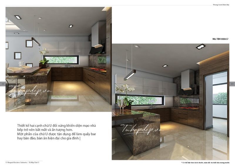 Mẫu thiết kế phòng bếp biệt thự, nhà phố hiện đại kết hợp tủ bếp chữ U và chữ I thông minh, tiết kiệm không gian.