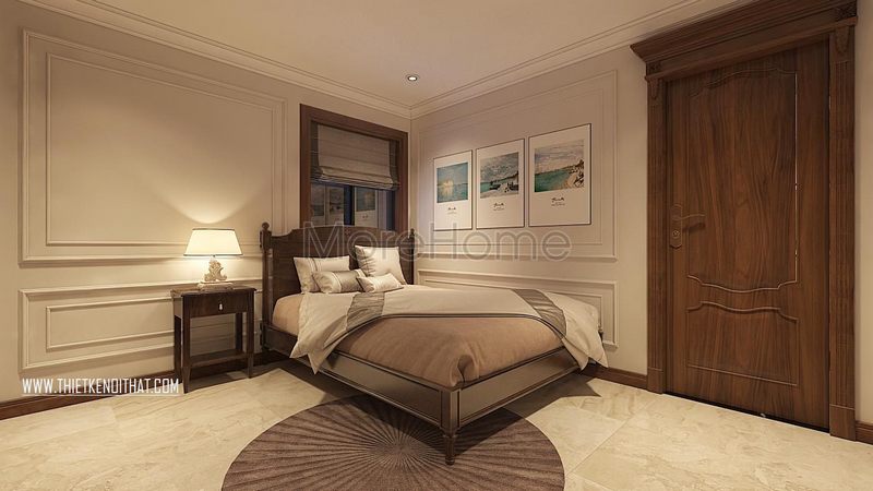 Thiết kế nội thất phòng ngủ biệt thự tân cổ điển sang trọng với sản phẩm giường ngủ gỗ óc chó, đầu giường bọc da cao cấp