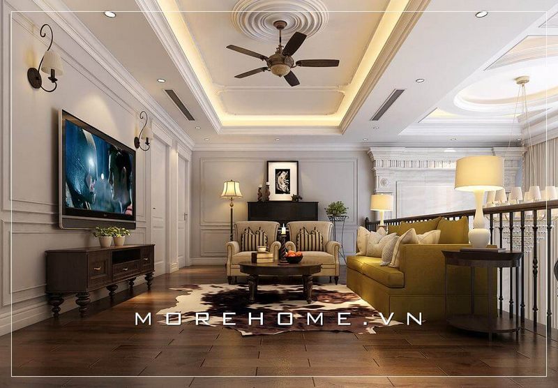 Để tạo ra một không gian phòng khách biệt thự, nhà phố tân cổ điển sang trọng thì không thể không kể đến những chi tiết nhỏ như rèm cửa, kệ TV, đèn chùm treo trần nhà, hay là những chạm khắc điêu luyện của trần nhà hết sức tinh tế. Đó là sự kết hợp hoàn hảo để tạo ra một không gian phòng khách mang phong cách tân cổ điển cao cấp.