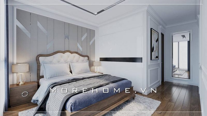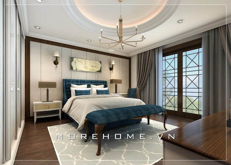 Thiết kế giường ngủ Master tân cổ điển sang trọng, màu sắc nhẹ nhàng tinh tế không quá cầu kỳ tạo cảm giác thư thái và nhẹ nhàng trong mỗi giấc ngủ