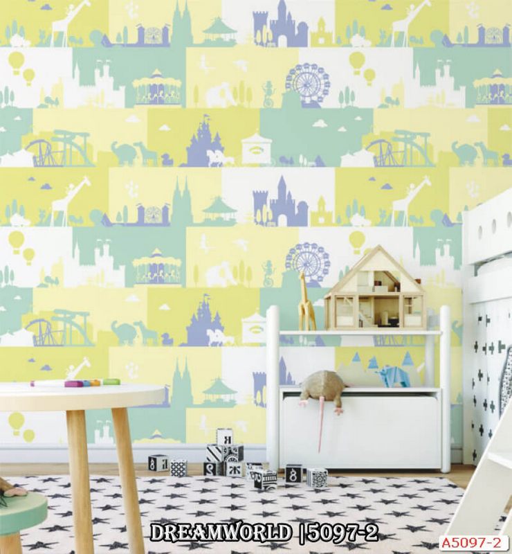 Phối cảnh 3D trang trí không gian sinh hoạt của bé được trang trí bởi mẫu giấy dán tường DreamWorld 5097-2