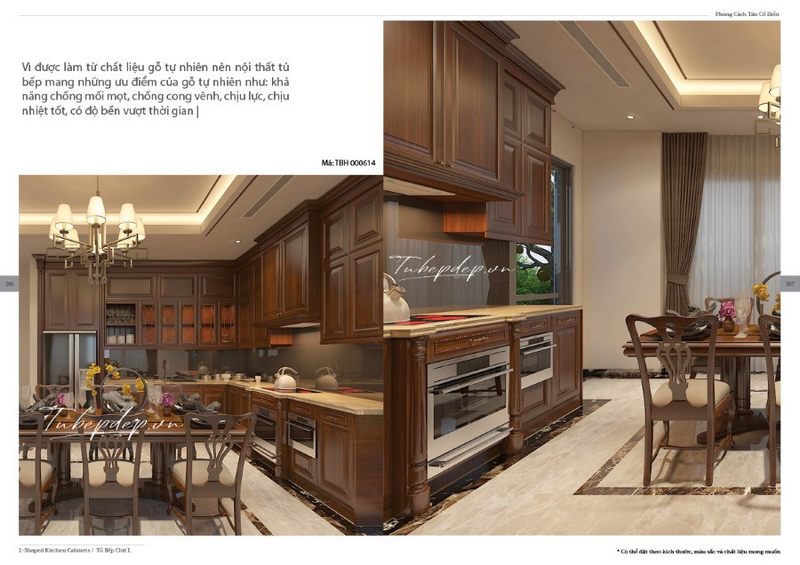 Bàn ăn thường sẽ được đặt ngay trong phòng bếp để tiện sinh hoạt hơn. Từ tủ bếp đến bàn ăn đều làm từ tự nhiên sơn bóng ấn tượng sang trọng hơn với phong cách tân cổ điển