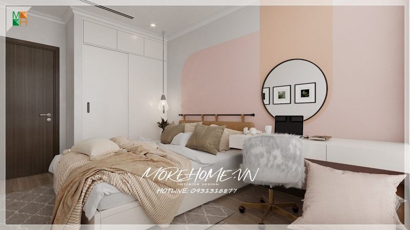 Tủ quần áo âm tường màu trắng tính tế với nhiều ngăn cất trữ đồ đạc giúp cho phòng ngủ được ngăn nắp mà không tốn quá nhiều diện tích của phòng